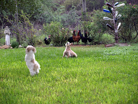 The other day I was feeding my girls a treat and Honey (my dog) joined them begging! I had one dog and eight chickens jumping for goodies! When the goodies were gone, Honey continued to sniff around looking for a tidbit. The chickens would come running when she seemed to find something.